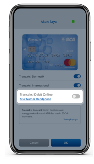 Pilih nomor yang terdaftar dan aktifkan tombol Transaksi Debit Online. Pastikan no. HP yang terhubung dengan BCA mobile & memiliki pulsa untuk pengiriman kode OTP untuk transaksi online