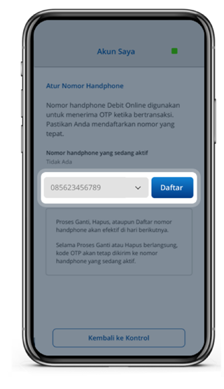 Catatan : Pendaftaran dan penggantian nomor handphone akan diproses secara langsung, sementara penghapusan nomor handphone akan efektif di hari berikutnya. Selama proses penghapusan berlangsung, kode OTP akan tetap dikirim ke nomor handphone yang sedang aktif.