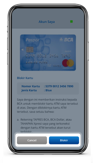 Untuk menonaktifkan fitur debit online dapat dilakukan melalui BCA Mobile pada menu “Akun Saya” lalu pilih menu “Kontrol” atau pada myBCA(Mobile dan Web) di menu "Akun Saya" dengan memilih "Kontrol Akun", pilih "Kartu Debit" lalu pilih "Kontrol Transaksi" kemudian geser tombol untuk non-aktifkan Transaksi Debit Online.
