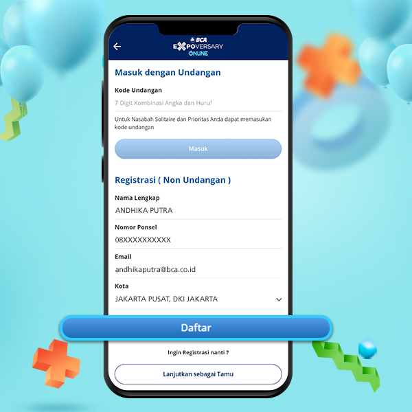 - Jika kamu dapet Undangan BCA Expoversary, silakan “Masuk sebagai Undangan” dengan masukkan kode Undangan, lalu klik “Masuk”.