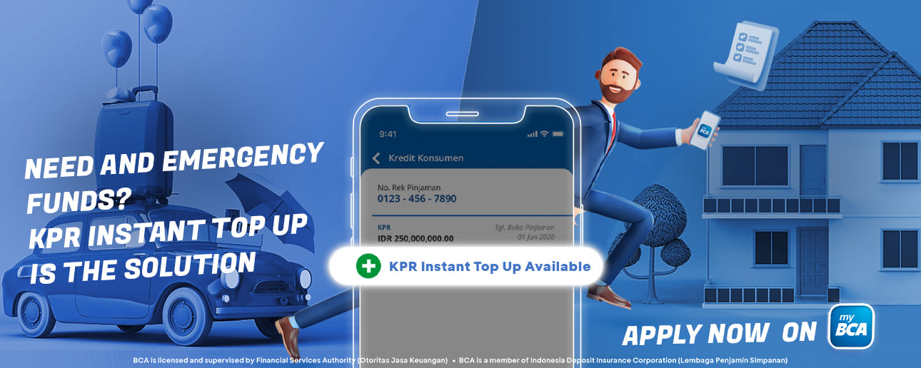 KPR Instant Top-Up is s top-up facility for customers to obtain additional funds for existing mortgage facilities with a faster and instant process through the myBCA app.