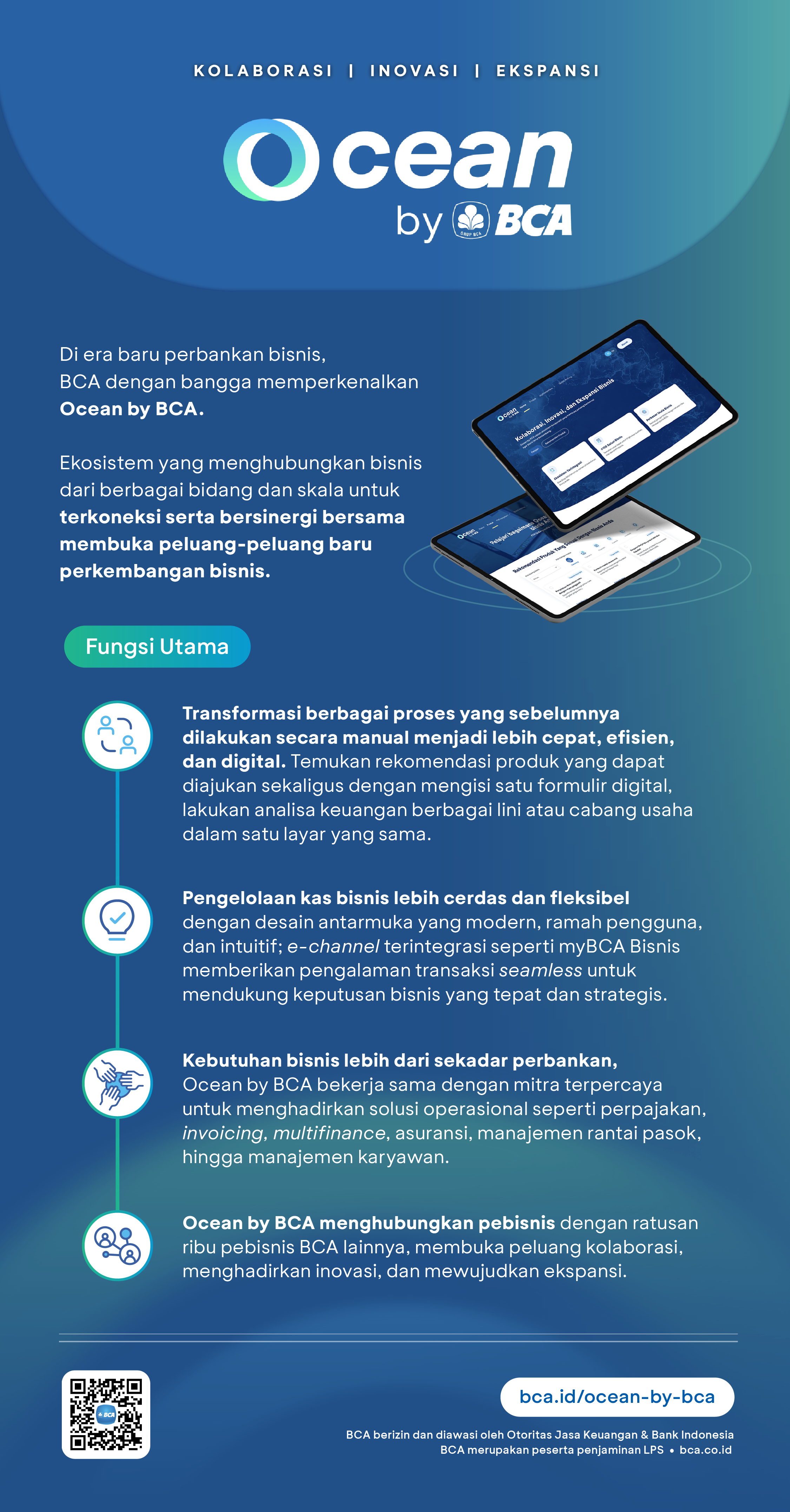 Ocean by BCA is a web portal designed to help BCA Business Customers and prospective customers access a wide range of business solutions provided directly by BCA and its partners. These include business information, recommended business solutions, and seamless access to e-channels in one platform. Customers with an existing myBCA Bisnis facility can log in using their BCA Business ID, which is the same combination of Corporate ID and User ID used on Ocean by BCA.