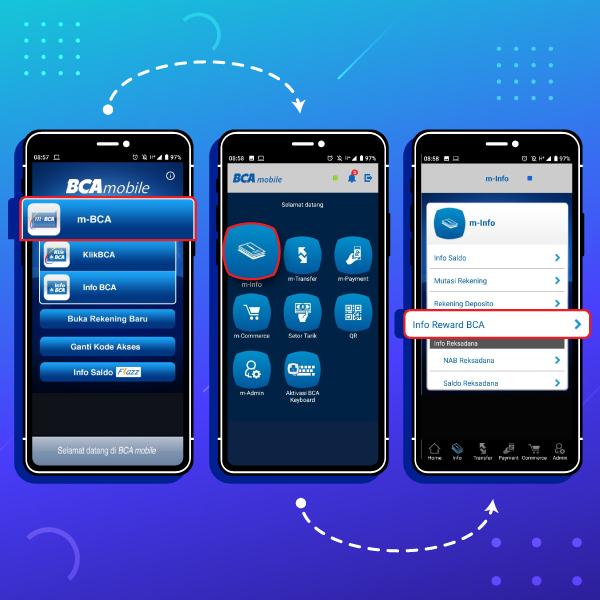 - Via BCA Mobile >> m-BCA >> m-Info >> Info Reward BCA (Android and iOS)