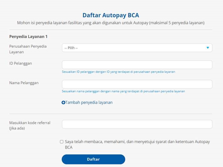 - Fill in the data of the service provider that you want to register to use Autopay BCA. In one autopay registration, 5 service providers can be registered at once