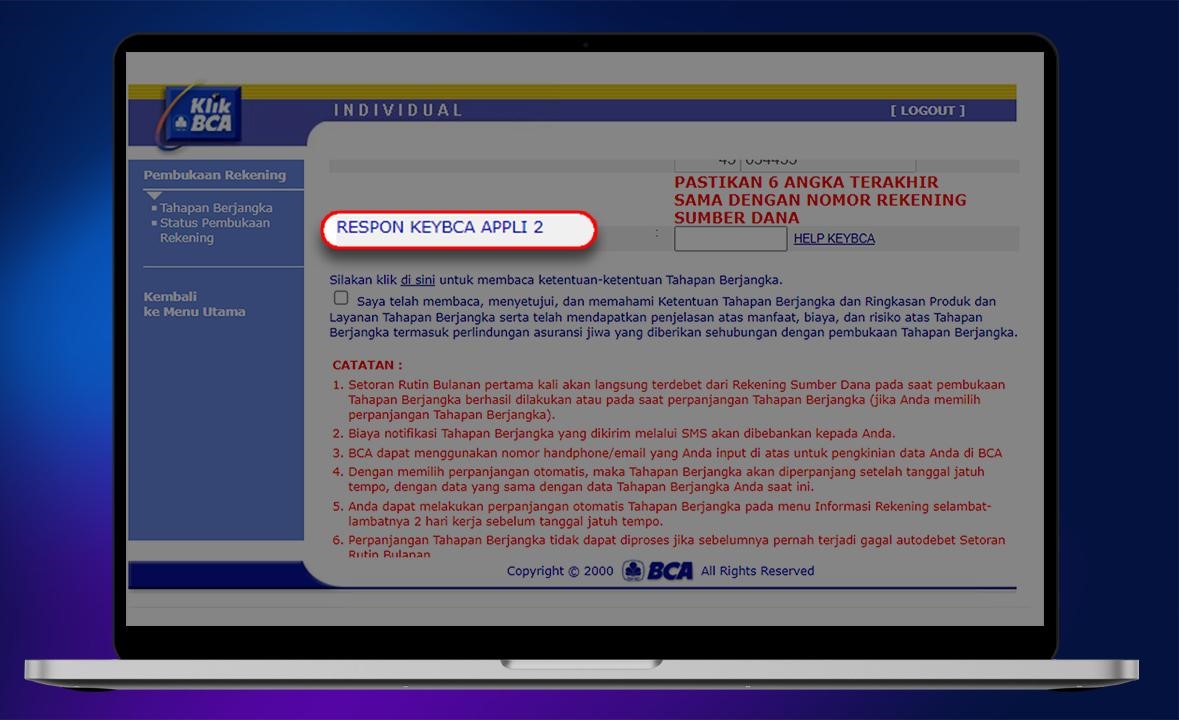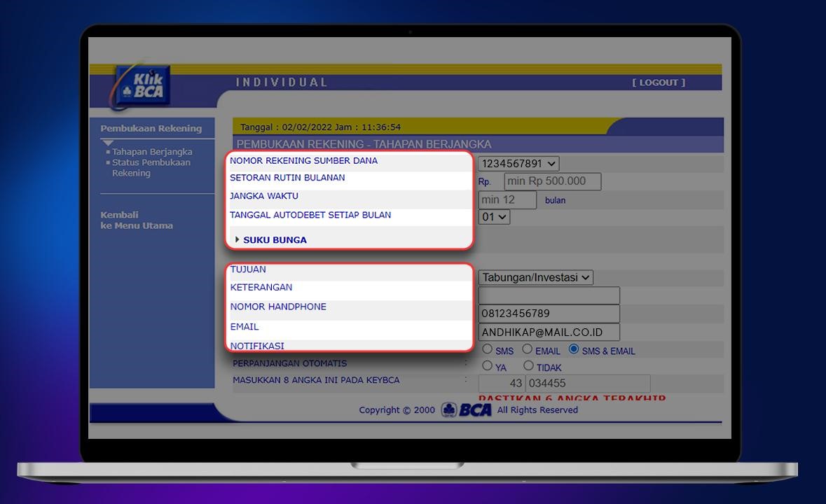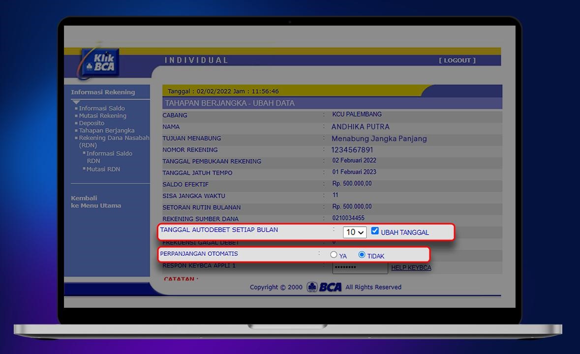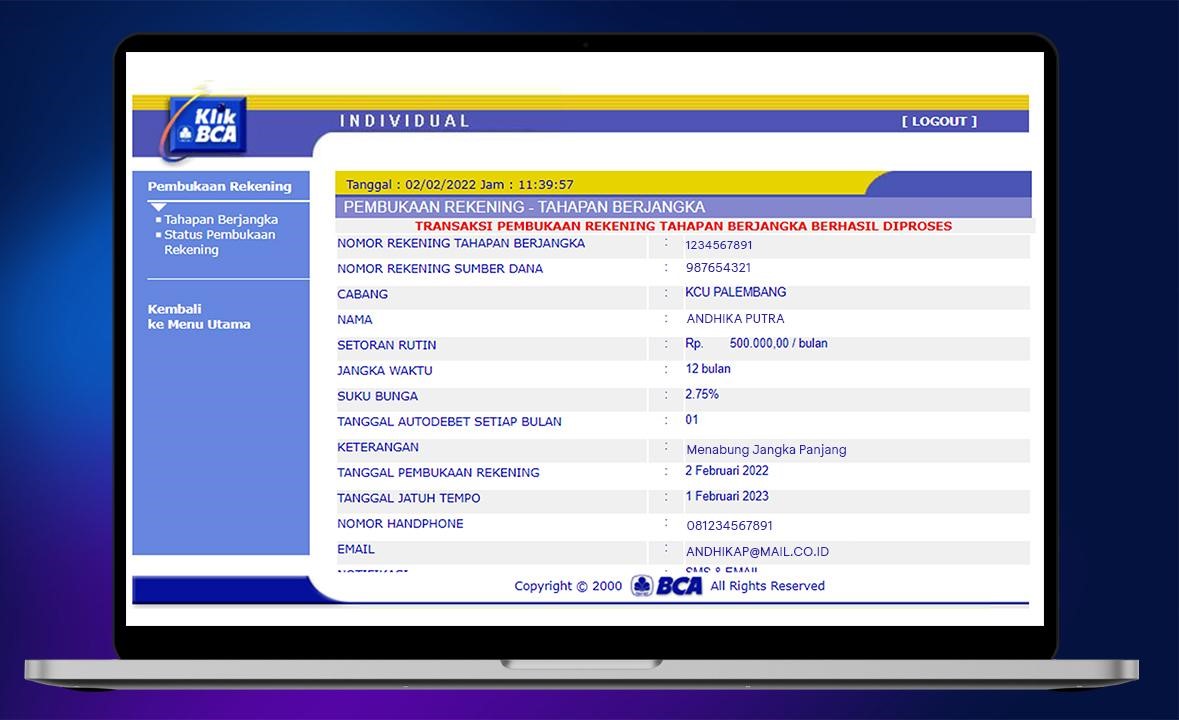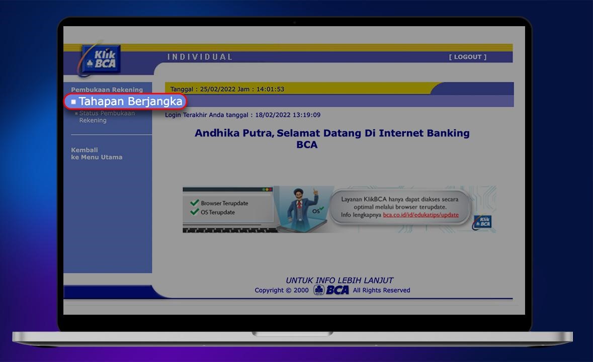 Currently, you can extend and make data changes (auto-debit date) to your Tahapan Berjangka BCA through KlikBCA. It means that you don’t need to open a new Tahapan Berjangka BCA when it reaches maturity. The extension adheres to the existing term and monthly deposit of the previous Tahaka BCA.