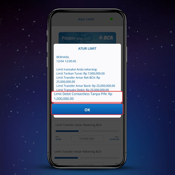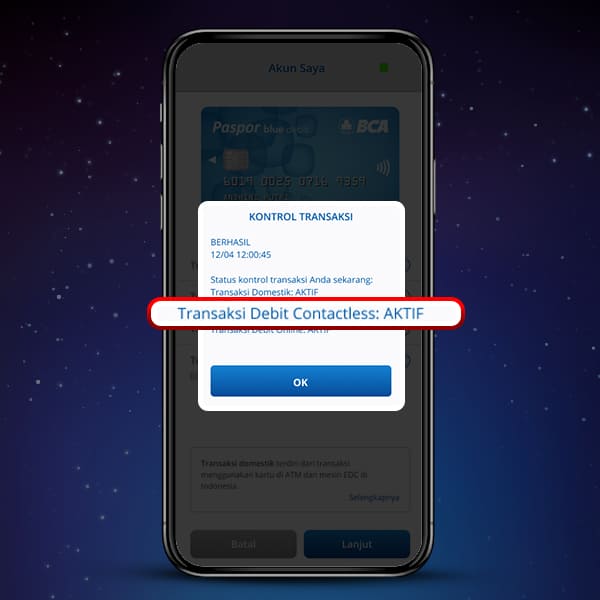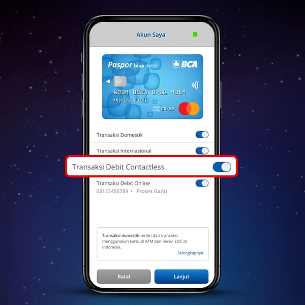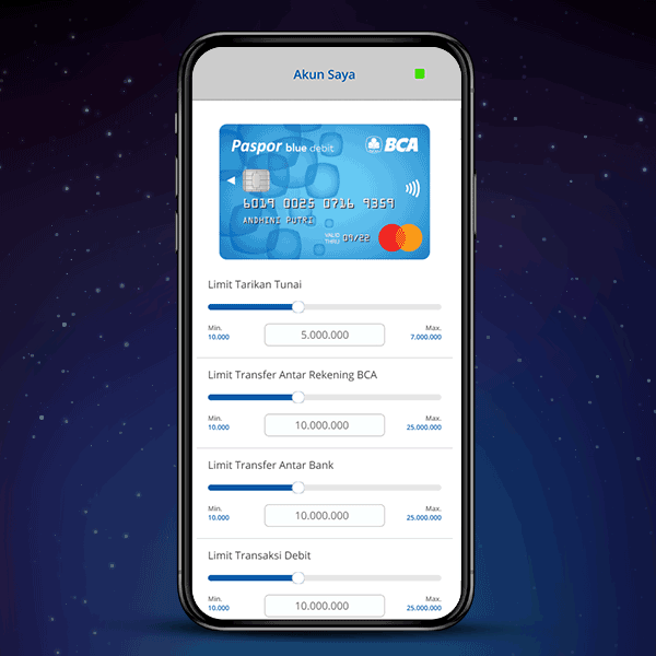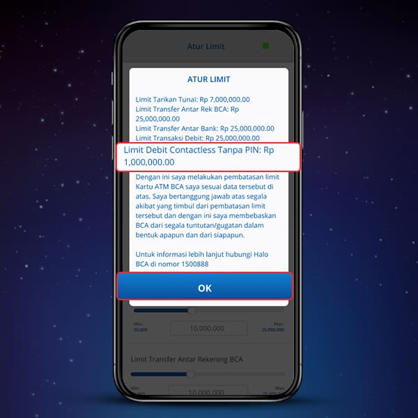 For contactless transactions, the daily accumulated transaction limit is Rp1 million/day/card, while for transactions above Rp1 million, PIN is required (Valid in Indonesia, the contactless transactions amount using PIN following the applicable policies of each country). Furthermore, customers can set the limit of contactless debit transactions without a PIN, and enable or disable the contactless feature through BCA mobile or myBCA.