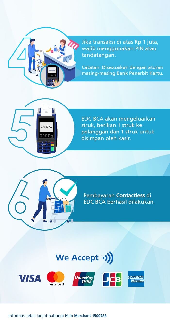 For payment transactions up to Rp1 million PIN is not required. However, for larger transactions of over Rp1 million, you are required to enter your PIN. Currently, contactless payments at EDC BCA can accept all cards, both domestic and international, with contactless logo such as Visa, Mastercard, Union Pay, JCB, and American Express.