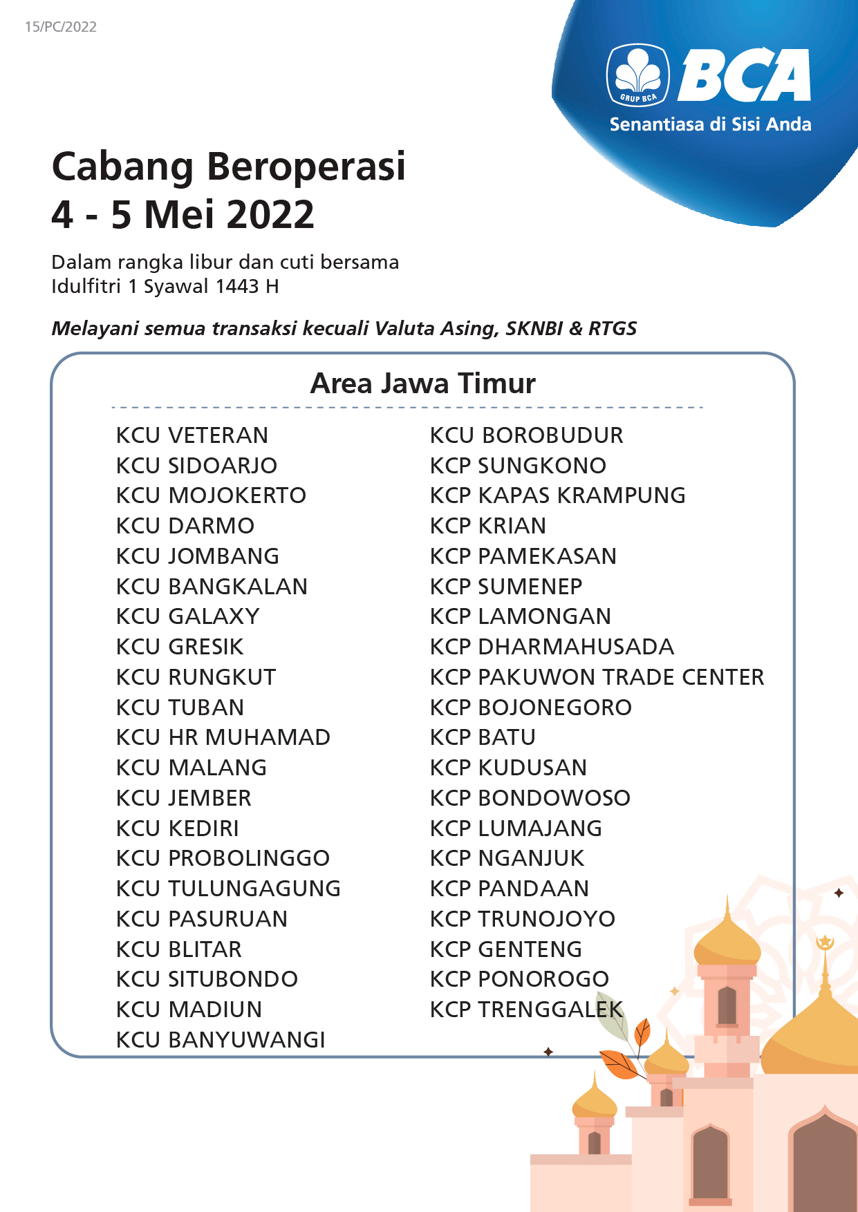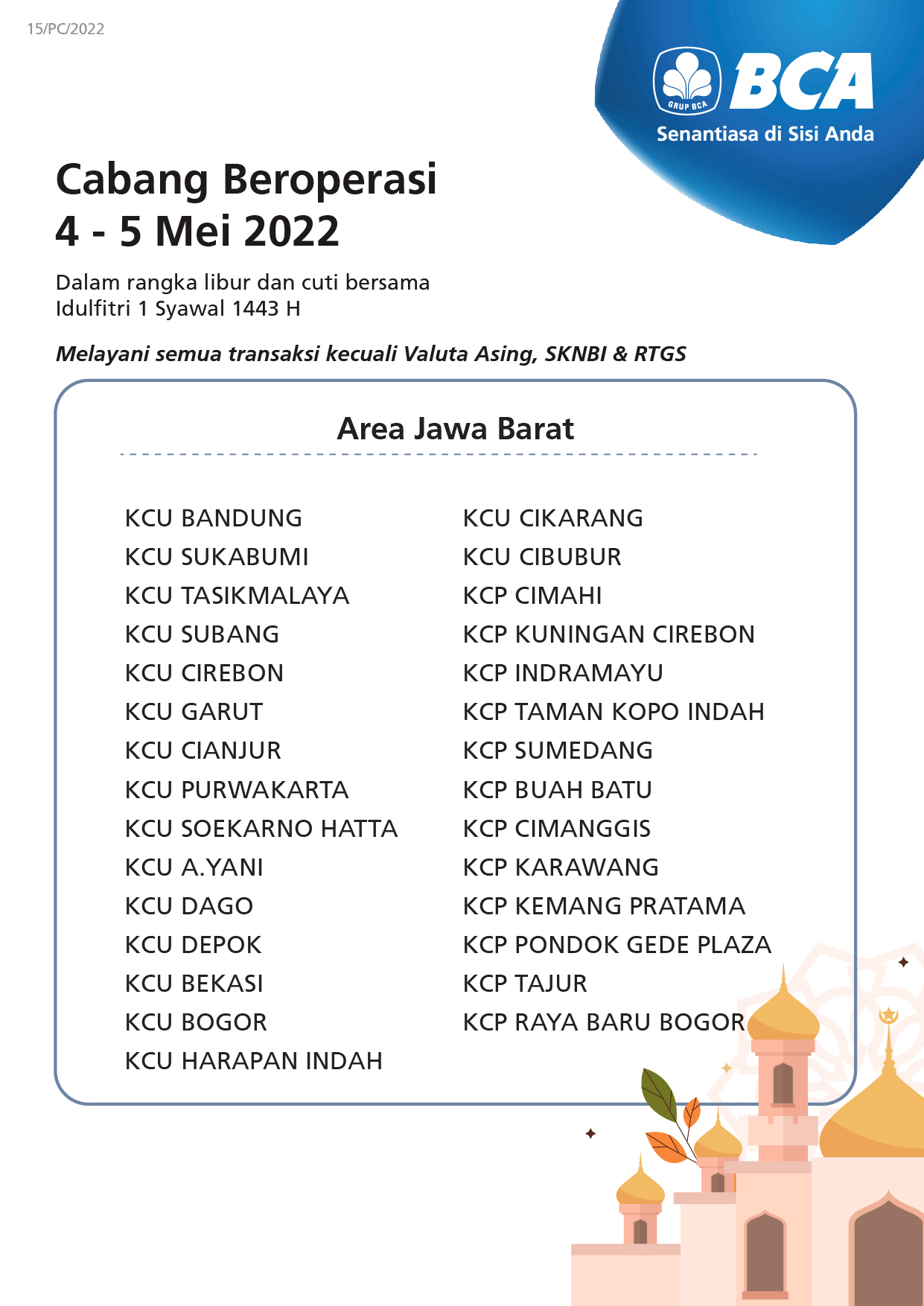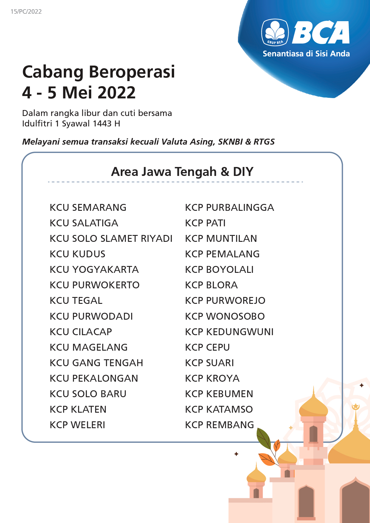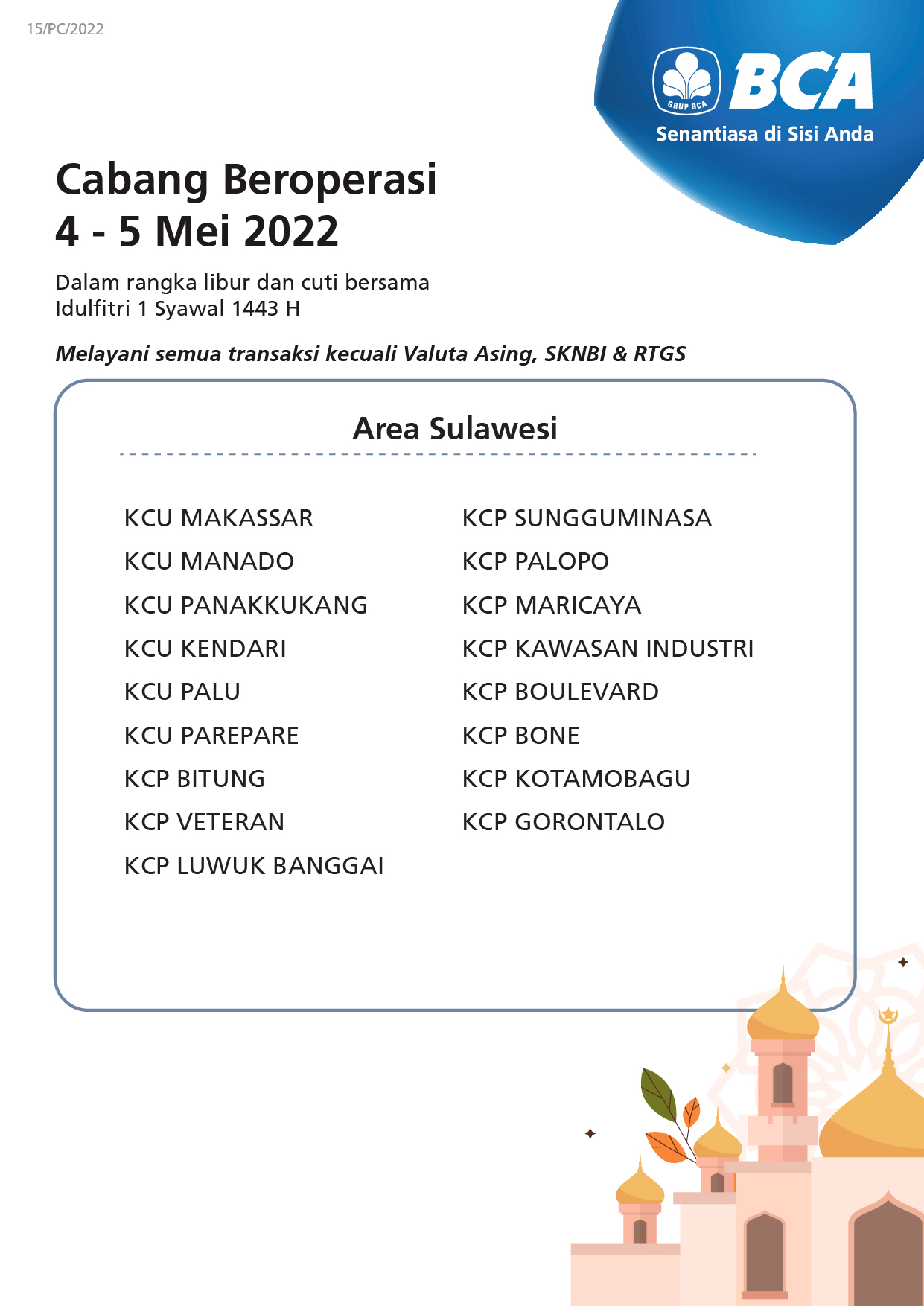 On 6-8 May 2022 all BCA branches will not operate, however, customers can still conduct banking transactions through various BCA facilities such as BCA mobile, myBCA, KlikBCA, and ATM BCA.