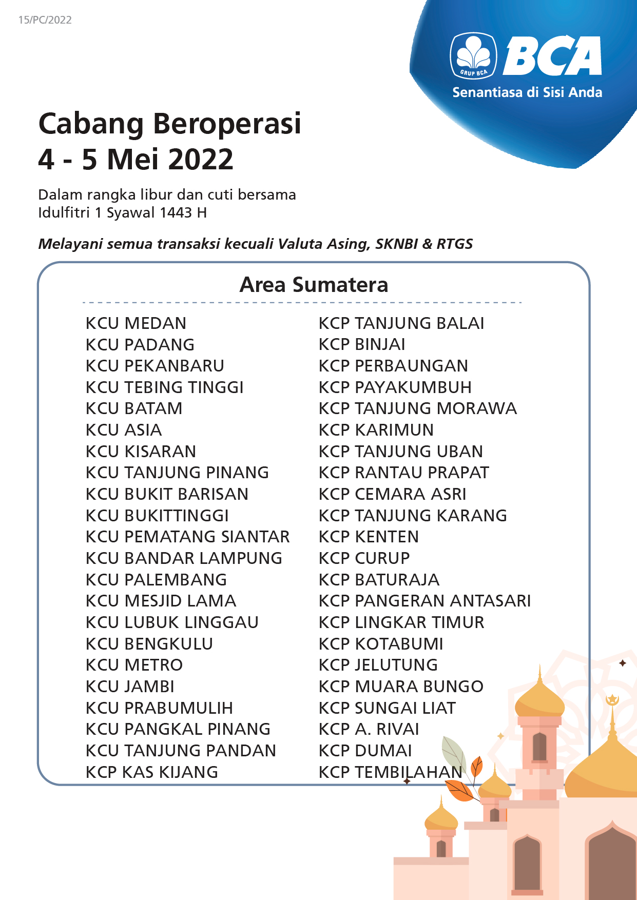 Here is a list of BCA branches remain operating on 4-5 May 2022: