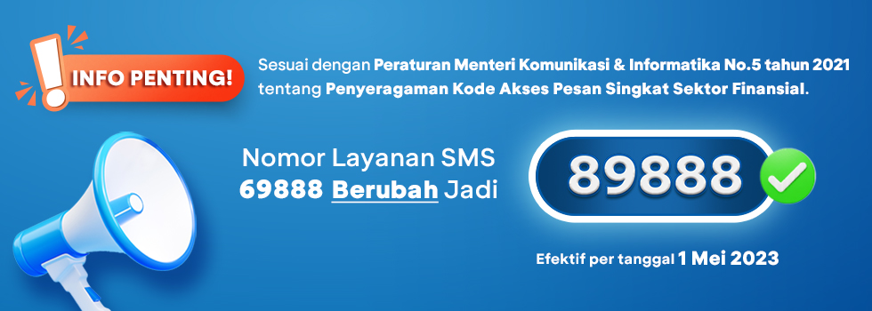 In accordance with the Regulation of the Minister of Communication and Informatics No.5 of 2021 regarding the Standardization of Access Codes for Financial Sector Short Messages, BCA will adjust its SMS service number from 69888 to 89888.