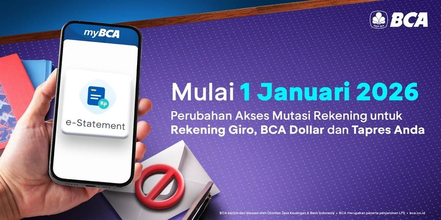 Efektif per 1 Januari 2026, kantor cabang BCA sudah tidak lagi menyediakan layanan rekening koran dalam format cetak (fisik) untuk produk Giro Perorangan, BCA Dollar, dan Tapres.