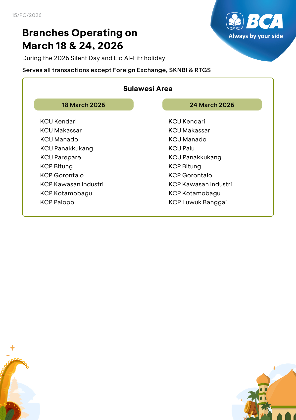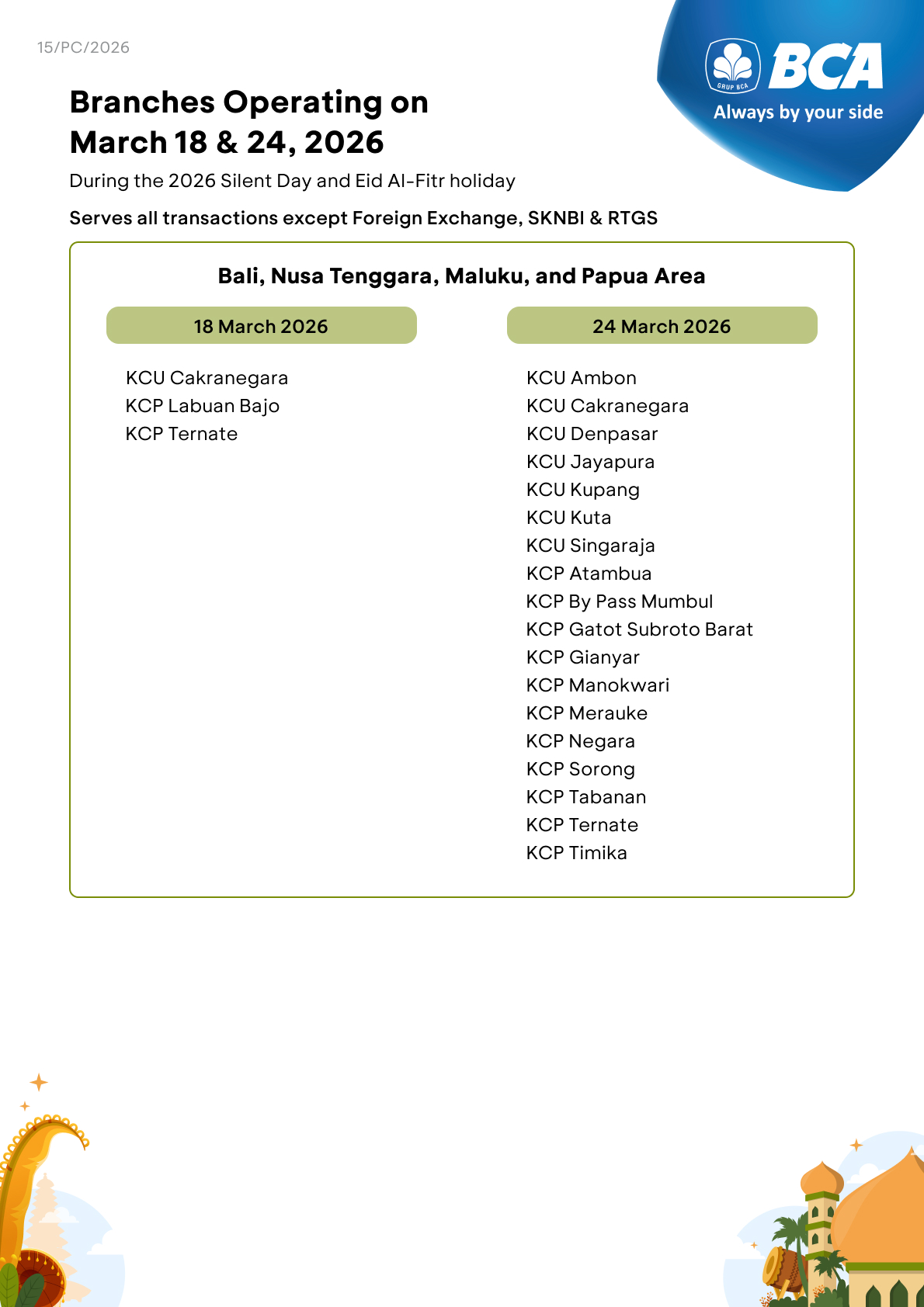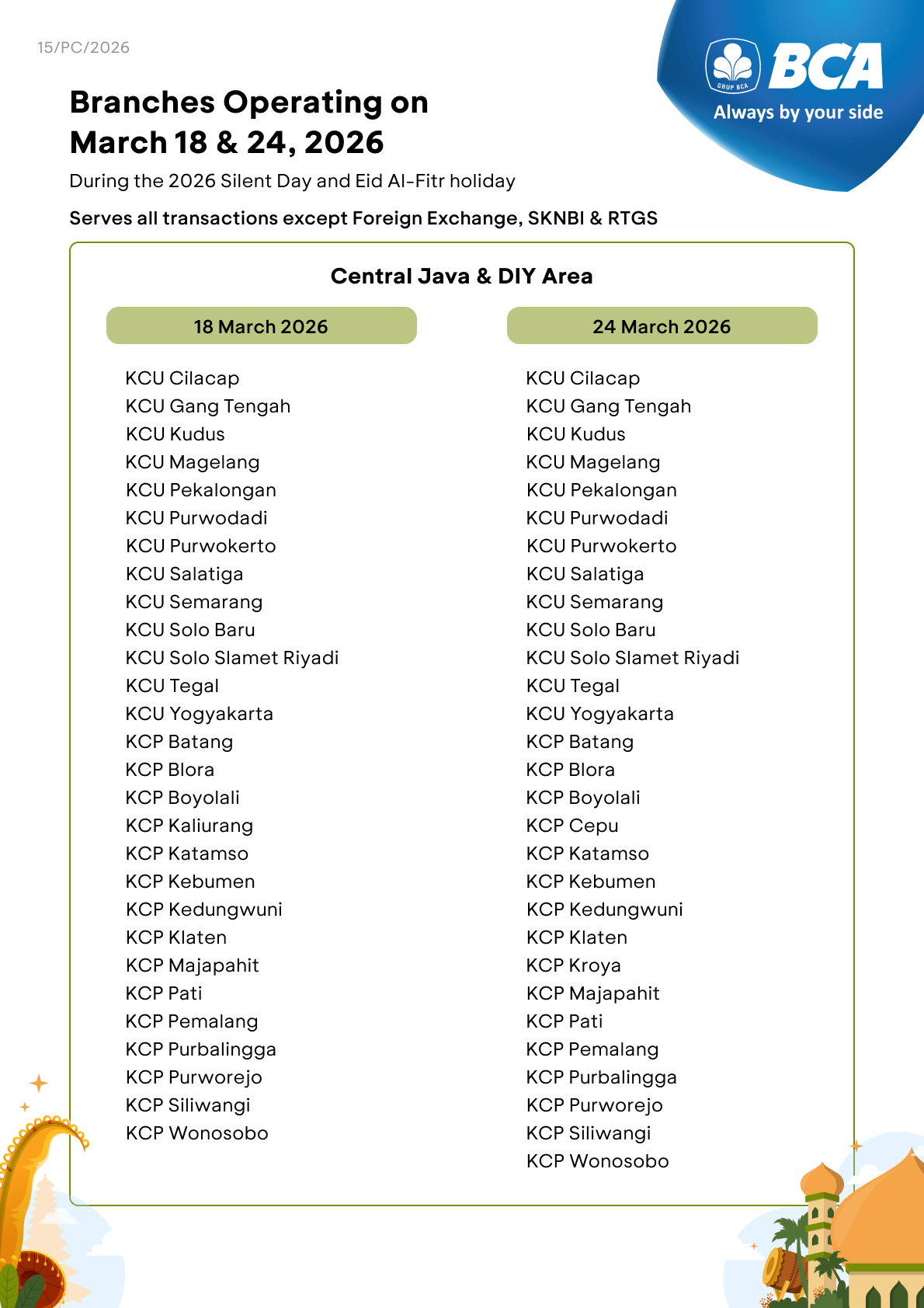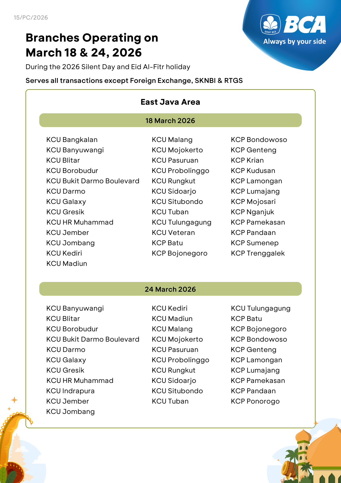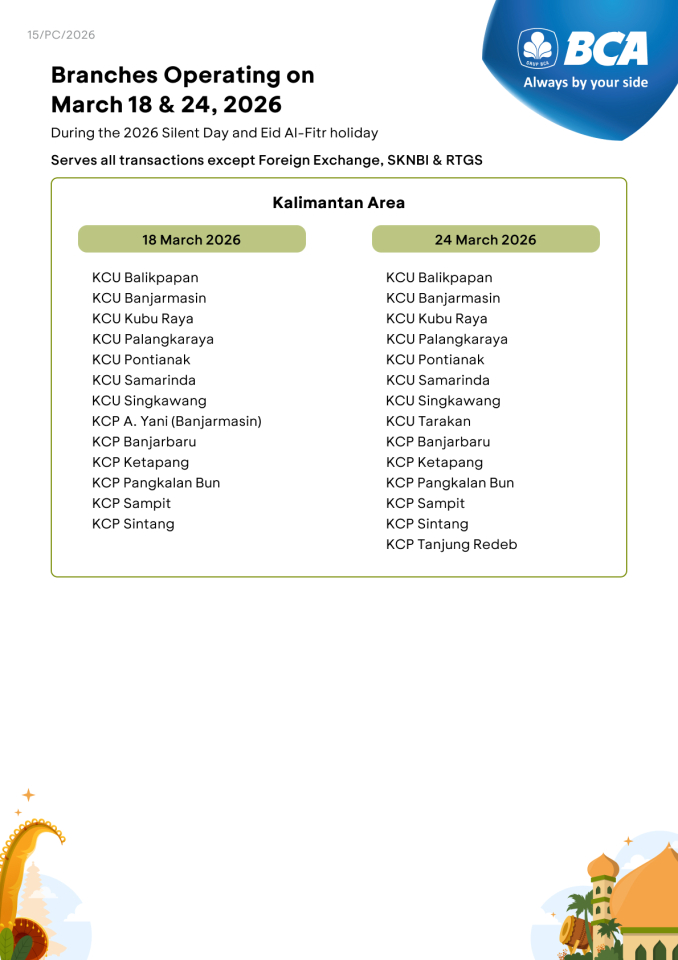All BCA branches will not operate on March 19 and 23, 2026. Specifically, on March 20, 2026, several BCA branches will operate only for B2B Pertamina services, i.e. KCU Bandung, KCU Galaxy, KCU Madiun, KCU Matraman, KCU Palembang, and KCU Semarang. However, customers can still make transactions using various BCA e-channel facilities, such as myBCA, BCA mobile, KlikBCA, and ATM BCA.