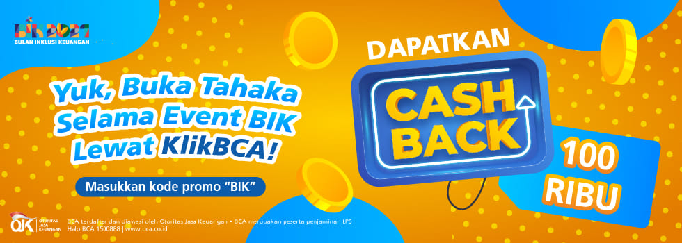 - Setiap Nasabah yang melakukan pembukaan rekening Tahapan Berjangka (TAHAKA) via KlikBCA Individu selama virtual event Bulan Inklusi Keuangan (periode tanggal 18 Oktober 2021 s.d 2 November 2021) dengan minimal setoran rutin bulanan sebesar Rp500.000,- (lima ratus ribu rupiah) dan tenor minimal 12 ( dua belas ) bulan (tidak berlaku kelipatan), akan mendapatkan cashback senilai Rp 100.000,- (seratus ribu rupiah).