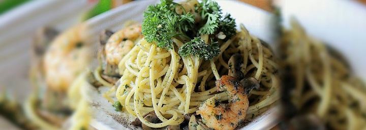 - Main course menu options, namely Margherita Pizza, Fish & Chips, Aglio Oglio, Bolognese & Kampung Fried Rice