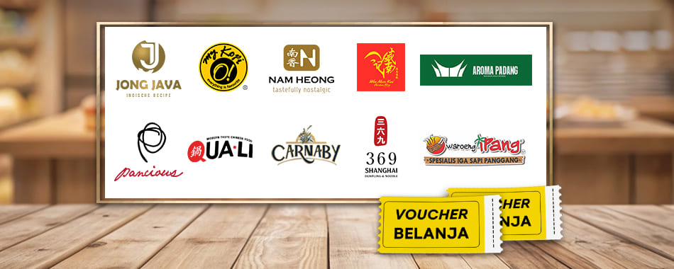 - Get lucky dip with prizes of voucher worth IDR25,000, IDR50,000, IDR100,000, IDR200,000, or IDR50,000 at Aroma Padang, Carnaby, Jong Java, my Kopi O, Nam Heong, Pancious, Qua-Li, Warung Ipang & Wee Nam Kee