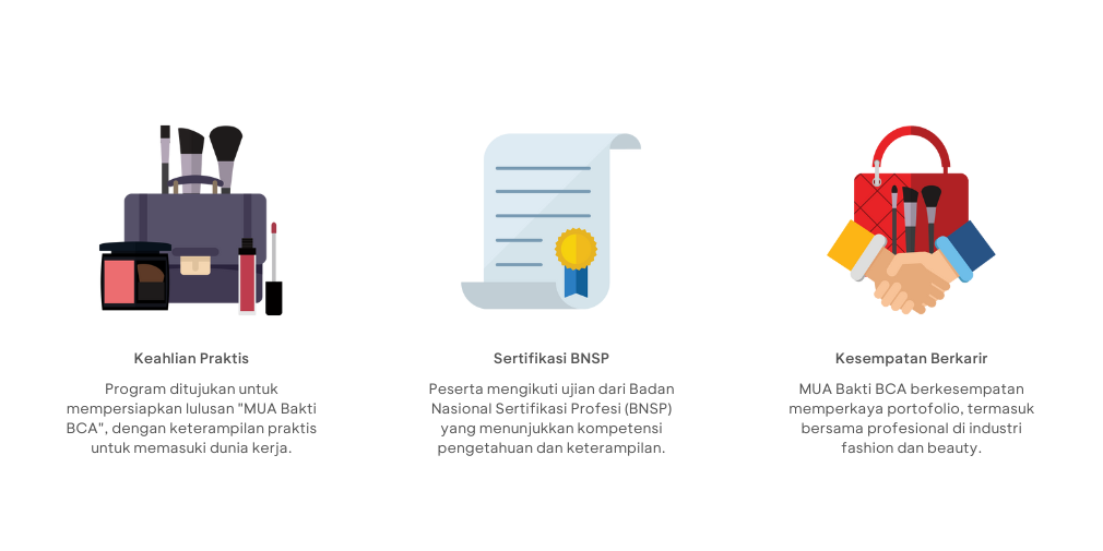 Untuk menjadi MUA Bakti BCA, peserta menjalani serangkaian proses, mulai dari tahap seleksi, pembekalan, praktik, hingga ujian sertifikasi BNSP. Setelah lulus, para MUA Bakti BCA langsung terjun ke dunia profesional dan mendapatkan exposure di berbagai kegiatan BCA.
