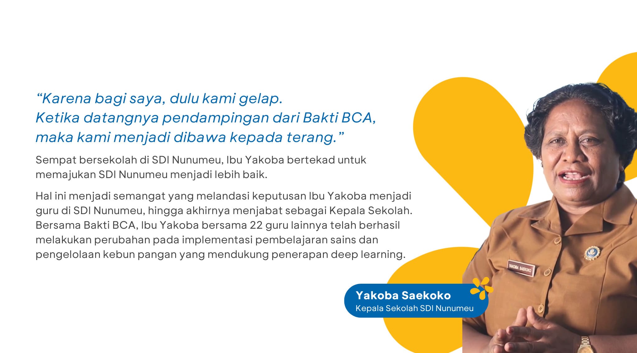 In 2024, the students and teachers of SD Inpres Nunumeu had the opportunity to spread inspiration and create a positive impact by participating in the production of the Kisah Jejak Bukti Bakti BCAvideo, together with BCA Bakti Ambassador, Nicholas Saputra. Watch the full video at: bca.id/buktibaktibca