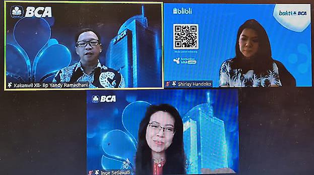 BCA and Blibli.com Hold Online Marketing Webinar – Executive Vice President of CSR of BCA Inge Setiawati (below), Head of Regional Office XII Yandy Ramadhani (top left), and Acting Vice President of Seller Engagement & Academy of Blibli.com Shirley Handoko (top right) during the Webinar “Digital Marketing Strategies on E-Commerce Platforms” on Wednesday (08/11). BCA collaborated with Blibli.com to host an online marketing webinar aimed at customers who want to start a business on e-commerce platforms. Various modern business solutions beneficial for borrowers and potential borrowers at BCA were thoroughly explored in the webinar. The program is expected to help improve the quality if human resources that subsequently increases economic capabilities and self-sufficiency.