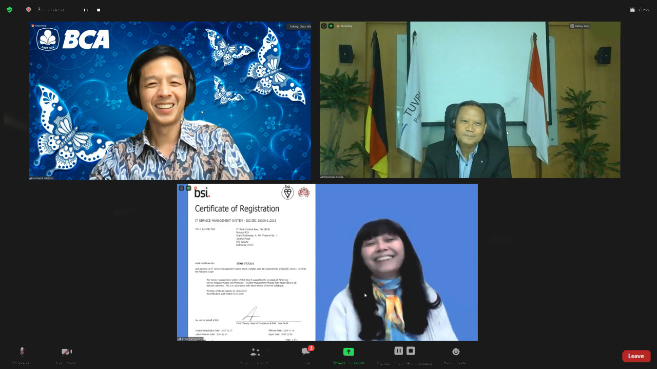 The handover of PCI DSS 3.2.1 certification was carried out by the President Director of PT TUV Rheinland Indonesia I Nyoman Susila and ISO 20000-1:2018 certification by the Managing Director of PT BSI Group Indonesia Erna Damayanti which was received virtually by the Vice President Director of BCA Armand Hartono accompanied by Executive Vice President IT BCA Jip Thomas Sutanto and Fransiscus Kaurrany on Wednesday (13/01).