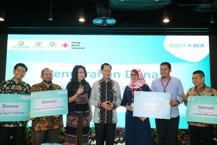 Presiden Direktur BCA Jahja Setiaatmadja bersama Executive Vice President Corporate Social Responsibility (CSR) BCA Inge Setiawati menyerahkan secara simbolis donasi 1 buah mikroskop dan instrumen katarak kepada Ketua SPBK Perdami Pengurus Pusat Umar Mardianto, donasi 1 buah mikroskop kepada Ketua Perdami Cabang DKI Jakarta Elvioza, dukungan pembelian donasi 1 mesin phacoemulsifikasi kepada perwakilan Perdami Cabang Riau Isfiyanto serta donasi 6 set Blood Scale & Mixer kepada Pengurus PMI Provinsi DKI Jakarta Rudi Hatibie, dan Wakil Kepala UTD PMI DKI Jakarta Ni Ken Ritchie di Jakarta, Selasa (03/11). Donasi tersebut ditujukan untuk mendukung peningkatan kualitas layanan kesehatan di Indonesia.