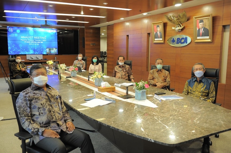 BCA’s First Quarter 2021 Financial Results – BCA's President Commissioner Djohan Emir Setijoso (second from the right), President Director Jahja Setiaatmadja (center), Deputy President Director Suwignyo Budiman (right), Director Rudy Susanto (left), Director Vera Eve Lim (second left), Director Santoso (left) and Director Subur Tan (front) during the presentation of BCA's First Quarter 2021 Financial Results, Jakarta, Thursday (22/04). In the first quarter of 2021, the bank recorded a 7.0% (YoY) growth in net profit, up to Rp7.0 trillion. Current account and savings account (CASA) rose by 15.4% (YoY) up to Rp655.8 trillion, contributing to Third-Party Deposits’ 14.6% (YoY) growth up to Rp849.4 trillion. Meanwhile, time deposits grew by 12.2% (YoY) up to Rp193.6 trillion. The robust increase in Third-Party Deposits has helped push total assets growth by 12.1% (YoY), amounting to Rp1,090.4 trillion by the end of March 2021.