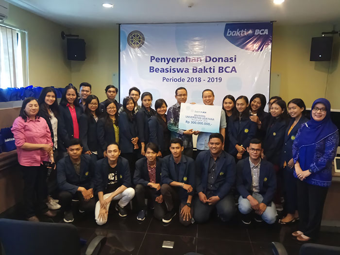 Beasiswa Bakti BCA senilai Rp300 juta diserahkan secara simbolis oleh Kepala Pendukung Operasi Wilayah IV BCA Pranoto kepada Kepala Biro Kemahasiswaan Universitas Udayana I Dewa Gede Oka di Bali, Jumat (15/02).