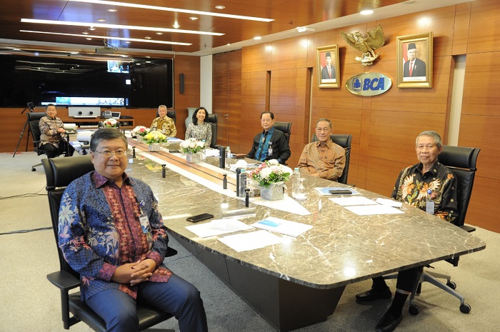 BCA's 2021 Third-Quarter Results – Bank Central Asia's (BCA) President Commissioner Djohan Emir Setijoso (second right), President Director Jahja Setiaatmadja (middle), Deputy President Director Suwignyo Budiman (right), Director Rudy Susanto (left), Director Vera Eve Lim (second left), Director Subur Tan (front), and Director Santoso (behind) at the presentation of BCA's 2021 third-quarter results in Jakarta, Thursday (21/10). In the third quarter of 2021, the bank's net profit increased by 15,8% YoY up to Rp23.2 trillion. The bank also recorded a solid performance in Third-Party Funds. CASA rose by 21.0% YoY up to Rp721.8 trillion in September 2021. Time Deposits increased by 9.7% YoY up to Rp201.9 trillion. Third-Party Funds increased by 18.3% to Rp 923.7 trillion, with total assets growing by 16.5% YoY up to Rp 1,169.3 trillion.