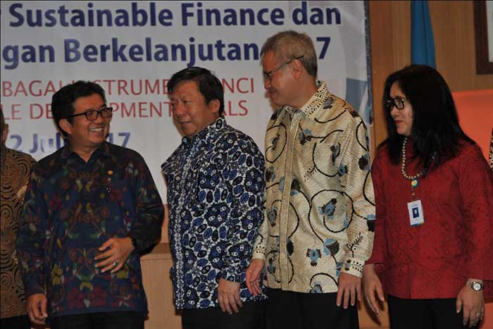 Head of Commissionaire Board of OJK Muliaman D Hada (center) addressed an appreciation to Director of PT Bank Central Asia Tbk (BCA) Rudy Susanto (second right) at the closing event of the pilot project ‘First Movers on Sustainable Banking’ in Bali, Wednesday (12/07). BCA is committed to Sustainable Finance principles that integrate environmental, social and governance (LST) aspects in the daily banking operations by engaging in the pilot project ‘First Movers on Sustainable Banking’ initiated by the Financial Services Authority (OJK) since 2015.