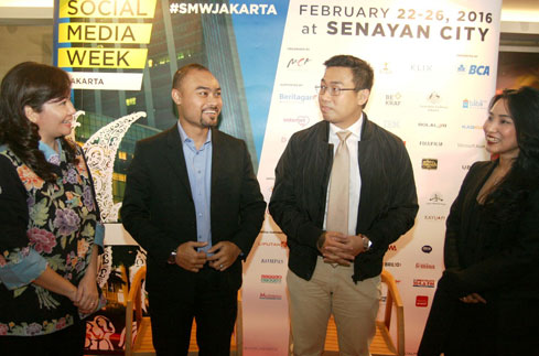 Head of Marketing Communication PT Bank Central Asia Tbk (BCA) Esther Meliana (kiri) memaparkan dukungan BCA pada pelaksanaan Social Media Week 2016 disaksikan Deputi Fasilitas Hak Kekayaan Intelektual & Regulasi, Badan Ekonomi Kreatif Ari Juliano (kedua kiri), Chairman of Social Media Week Jakarta & CEO Merah Cipta Media Group Antonny Liem (kedua kanan), dan General Manager Marketing & Promotion Senayan City Frances Jaclyn Halim (kanan), Senin (22/02). Social Media Week 2016 yang mengangkat tema “The Invisible Hand – Hidden Forces of Technology” berlangsung pada 22-26 Februari 2016 di Senayan City Hall, Jakarta. Acara ini merupakan bentuk dukungan penuh BCA bagi perkembangan dan kontribusi dunia digital dan teknologi dalam kehidupan masa kini untuk mempermudah dan memberi nilai tambah bagi kualitas kehidupan masyarakat Indonesia, khususnya masyarakat yang melek dengan dunia digital.