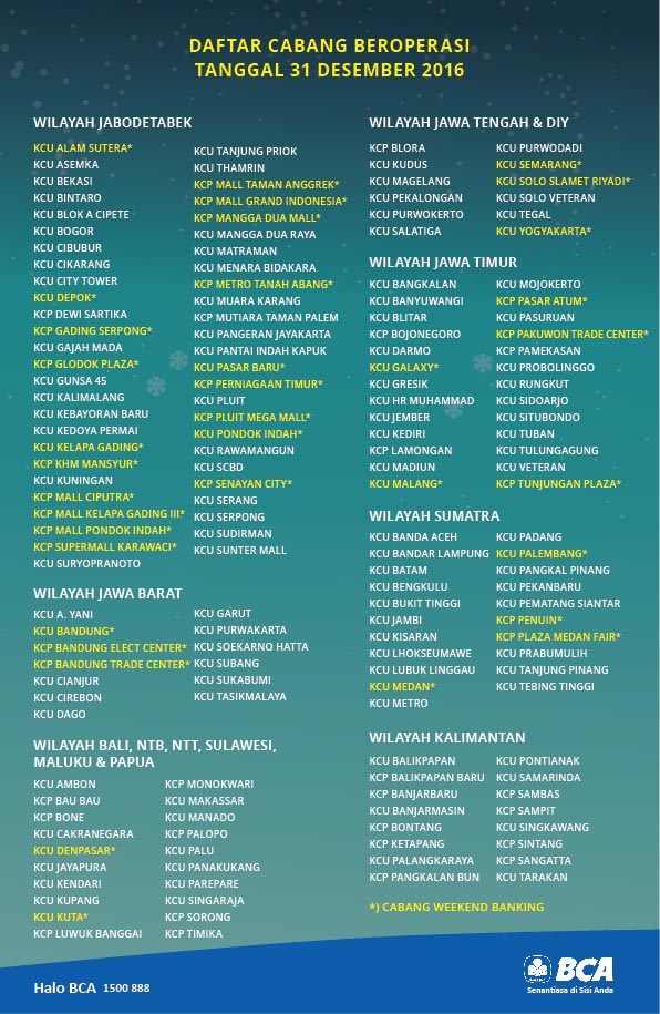 For customers interested in receiving more information on the list of operational branch offices, weekend banking, BCA promotions, and the nearest ATM location during Christmas and New Year Holiday period, please access our website www.bca.co.id or call Halo BCA (1500888).