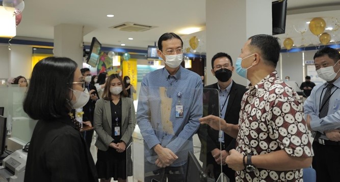 Direktur BCA Santoso menyapa salah satu nasabah pada momen Hari Pelanggan Nasional 2022 di KCU BCA Thamrin, Jakarta pada Jumat (02/09).