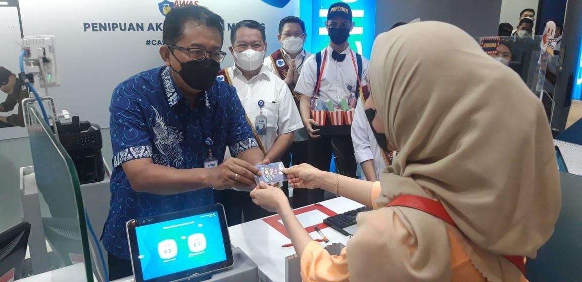 Direktur BCA Antonius Widodo Mulyono menyerahkan Kartu Flazz BCA kepada nasabah sebagai tanda terima kasih pada momen Hari Pelanggan Nasional 2022 di KCU BCA Matraman, Jakarta pada Jumat (02/09).