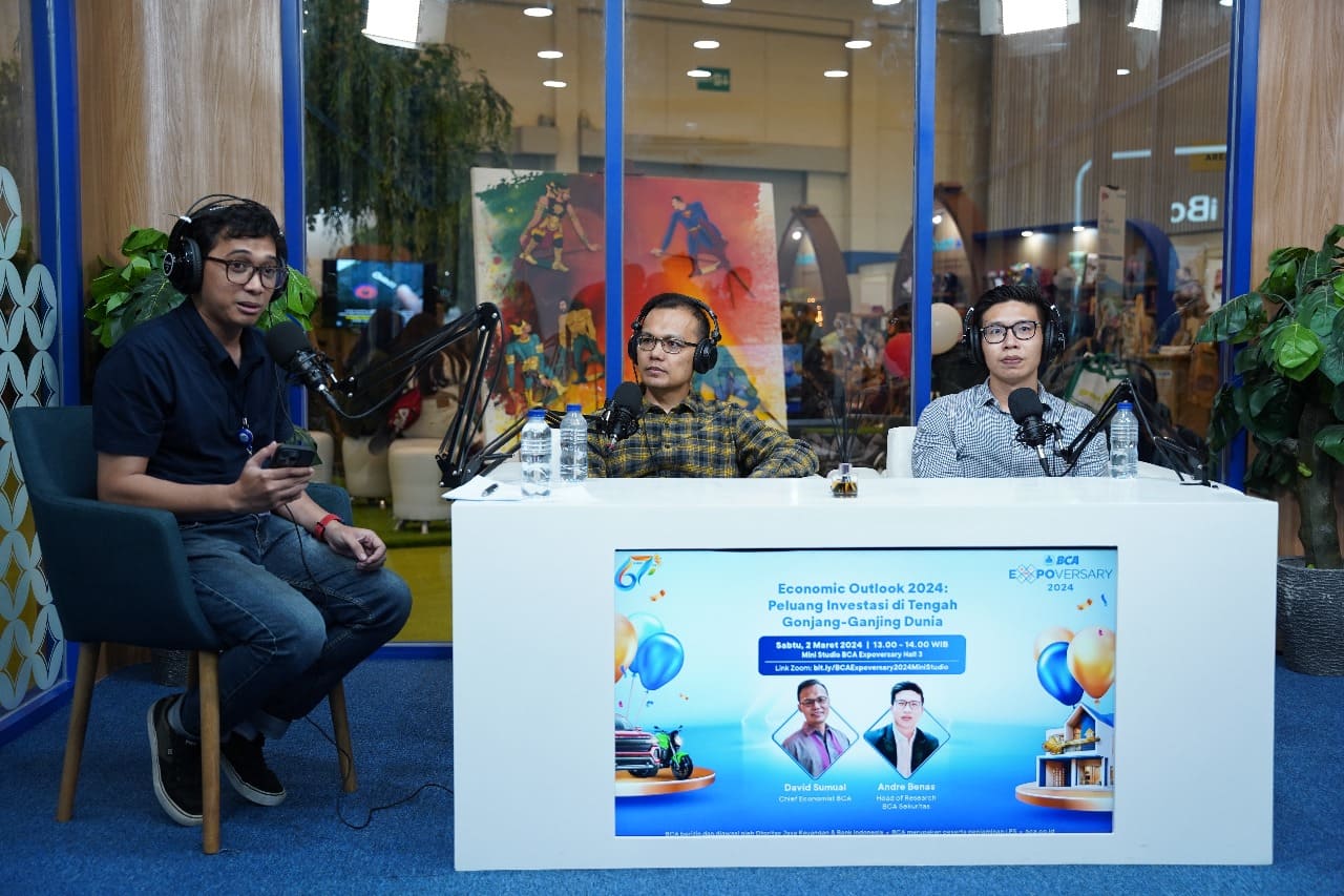 Positive Signals for Banking Issuers - BCA Chief Economist David Sumual (center) and BCA Sekuritas Head of Research Andre Benas (right) at the BCA Expoversary 2024 mini studio session titled "Economic Outlook 2024: Investment Opportunities Amid World Turmoil" at ICE BSD, Tangerang. Banking issuers are predicted to continue their positive performance in 2024, despite this year's challenges. Banking issuers have the opportunity to continue the trend of high net profit as happened in 2023.