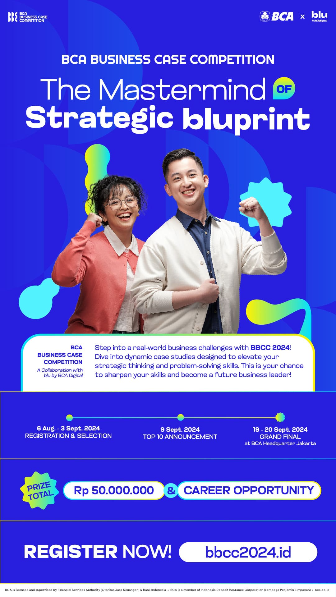 Jakarta, 27 August 2024 - PT Bank Central Asia Tbk (BCA) is once again organizing the “BCA Business Case Competition 2024” for university students across Indonesia. Themed “The Mastermind of Strategic bluprint”, this activity provides participants with the opportunity to win prizes worth a total of Rp50 million, as well as internship and career opportunities at BCA.