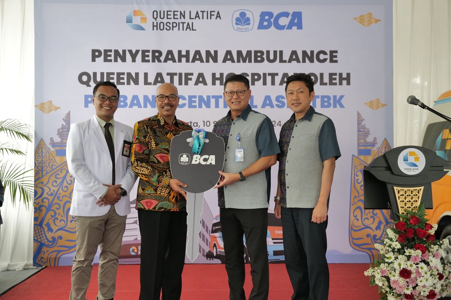 BCA Donates Ambulance to RSU Queen Latifa at New Building Launch - BCA Director John Kosasih (second from right) accompanied by Head of BCA Region II Widjaja Stephen (right) handed over 1 ambulance unit to PT. Queen Latifa Husada Jaya Director Syaifudin, M.Kes (second from left) and RSU Queen Latifa Director Dr. dr. Dani Sahirul Alim, MMR, MPM (left). The ambulance donation took place in conjunction with the opening ceremony of RSU Queen Latifa's new building on Tuesday (10/9) in Yogyakarta.