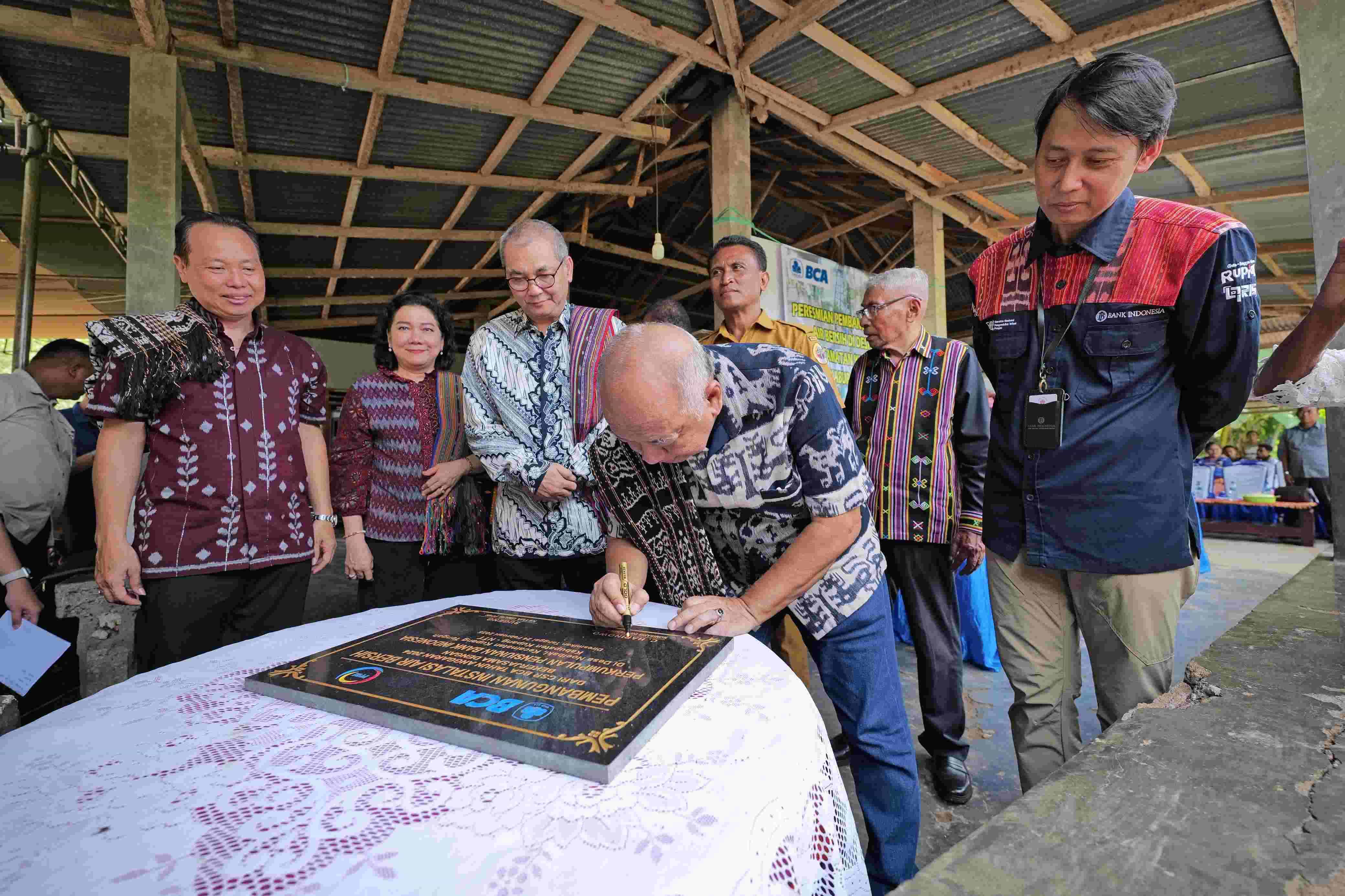 BCA Inaugurates Clean Water Installation in Kupang, Bringing Water Source Closer to the Community - BCA Independent Commissioner Cyrillus Harinowo (center) signs the inauguration inscription of the water installation with PPBI Deputy Chairman Arief Budi Santoso (third from left), Deputy Head of BI Representative Office of NTT Province Didiet Aditya Budi Prabowo (far right), BCA Head of Main Branch Office Kupang Pranoto (far left), and Representative of PPBI Member Suzanna (second from left) in Noelbaki village, Central Kupang, NTT, Monday (24/2). The clean water installation in Noelbaki village is expected to improve the welfare of the community, both in terms of health, economy, and overall quality of life.