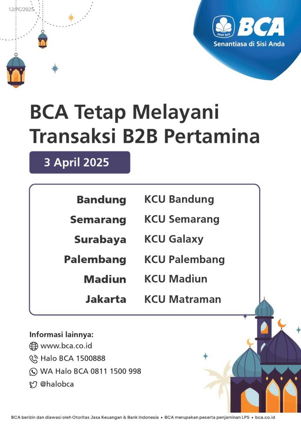 **Notes: On April 3, 2025, Pertamina B2B transactions are only available at the following branches: KCU Bandung, KCU Galaxy, KCU Matraman, KCU Madiun, KCU Palembang, and KCU Semarang.
