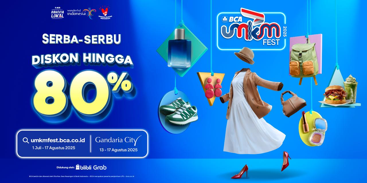 Promoted with the tagline "Serba Serbu di BCA UMKM Fest 2025," full event information is available at umkmfest.bca.co.id. The event showcases a selection of premium local products, competitive pricing, and a variety of appealing promotions, including: