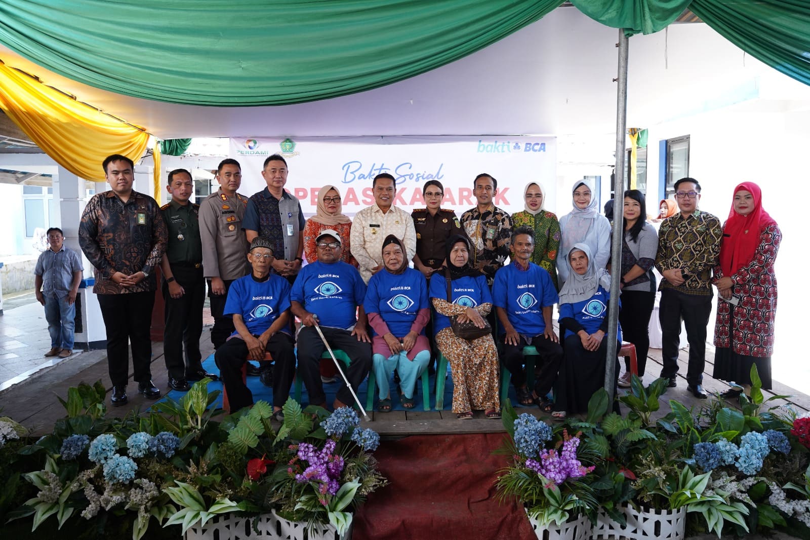 BCA and PERDAMI Hold Free Cataract Surgery Social Service Event in Bengkulu - Lebong Regency Head H. Azhari (sixth from the left), Lebong Regency Health Office Head Rachman (second from the right), Lebong General Hospital Director Eni Efriyani (fifth from the right), PERDAMI Central SPBK Representative Dinda Arken Devona (fourth from the right), Head of the Lebong District Prosecutor's Office Evelin Nur Agusta (center), and Head of BCA KCU Bengkulu Agus Susanto Wang (fourth from the left) pose for a photo with patients participating in the free cataract surgery, during the Social Service Cataract Surgery event held at the Lebong District General Hospital (RSUD), Lebong District, on Friday (15/8). In collaboration with the Cataract Blindness Prevention Section of the Indonesian Association of Ophthalmologists (SPBK PERDAMI), BCA supported 217 eyes in Lebong District and surrounding areas to regain clear vision.