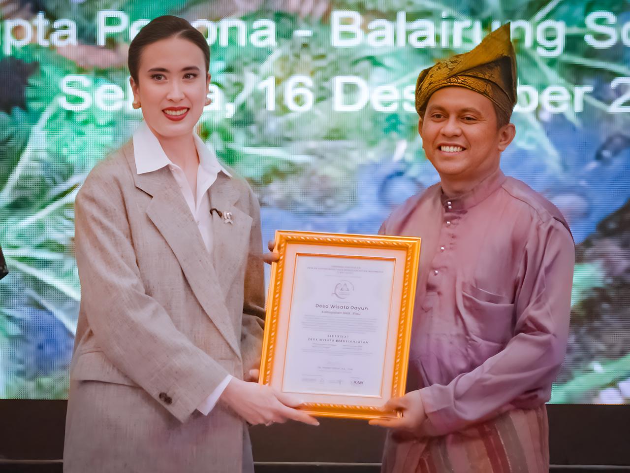 Sustainable Tourism Village Certification to Advance Sustainable Tourism Development in Indonesia - Minister of Tourism of the Republic of Indonesia Widiyanti Putri Wardhana (left) presents the Sustainable Tourism Village Certification to six Bakti BCA Tourism Villages, symbolically received by Nuvico Fishuri (right), Head of Pokdarwis. The program forms an integral part of the national sustainable tourism development strategy, aligned with the Sustainable Development Goals (SDGs) and tourism village development pillars: economic, socio-cultural, and environmental.