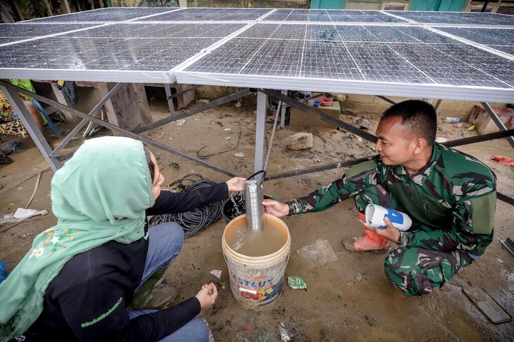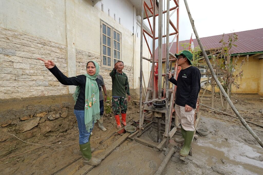 Supporting Access to Clean Water through Solar Panels and Water Pumps - BCA Corporate Communication & Social Responsibility EVP Hera F. Haryn (left) oversees the well drilling process and the installation of solar panels as power source for clean water pumps, ensuring access to safe water for flood-affected residents in Kualasimpang, Aceh Tamiang, on Monday (22/12). The solar panel installation was carried out by Bakti BCA in collaboration with the Indonesian National Armed Forces - Army (Tentara Nasional Indonesia Angkatan Darat/TNI AD).
