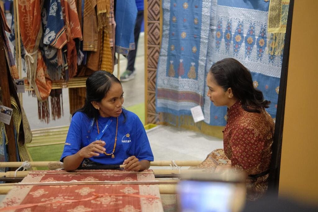 After being symbolically welcomed at the Bakti BCA booth, Deputy Minister of Tourism Ni Luh Puspa proceeded to visit the Wastra Warna Alam booth. She spoke directly with Diana Kalera Lena, a native weaver from Sumba. Diana plays an important role in the collaboration between her local weaving community and Bakti BCA. She was the first weaver from her community to join the natural-dyed textile training program and later encouraged 13 people from her village to participate in the program.