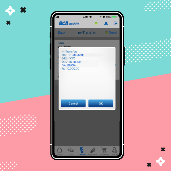 - Konfirmasi rekening tujuan dan nominal, jika benar klik OK, masukkan PIN, berhasil!