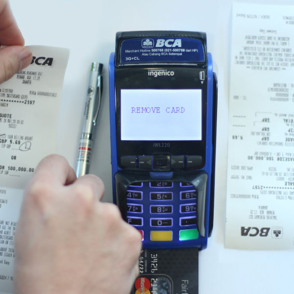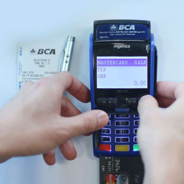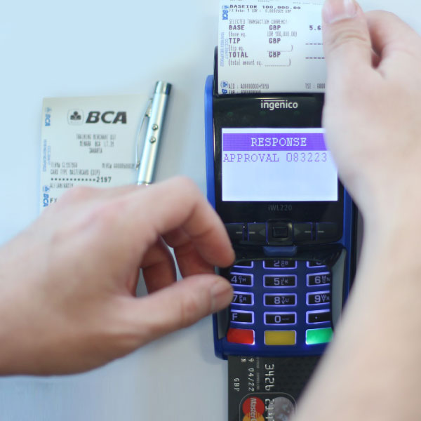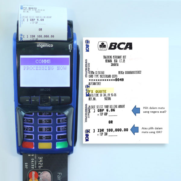 - Dip/swipe kartu Visa / MasterCard ke mesin EDC BCA. EDC otomatis akan mengenali pemegang kartu internasional yang memenuhi kriteria DCC.