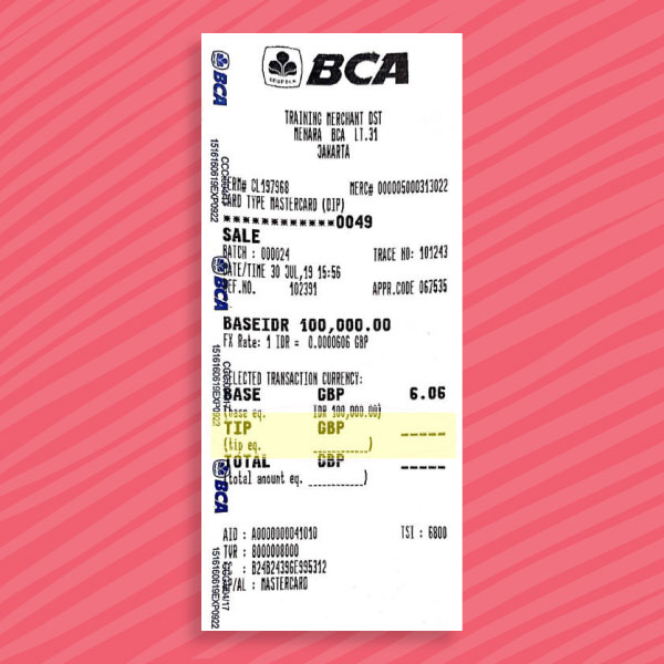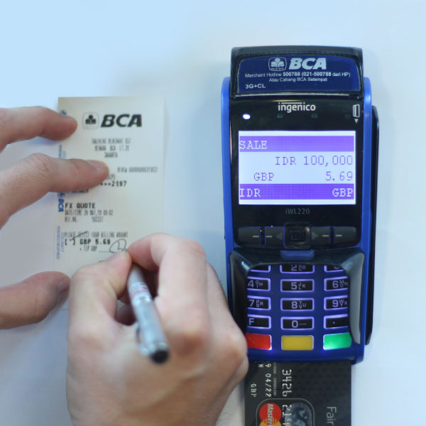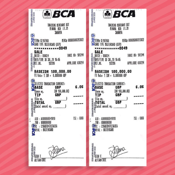 - EDC akan mencetak 2 sales receipt: 1 untuk pemegang kartu dan 1 untuk merchant (dalam nominal mata uang pilihan).