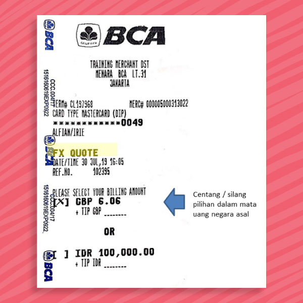 - EDC akan mencetak lembar “FX Quote”. Berikan ke pelanggan (pemegang kartu) untuk memilih mata uang yang diinginkan