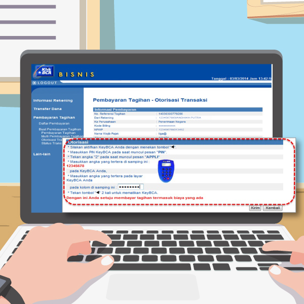 - Tampil halaman detail konfirmasi pembayaran pajak lalu masukkan respon KeyBCA APPLI 1 dan tekan tombol “Kirim”.