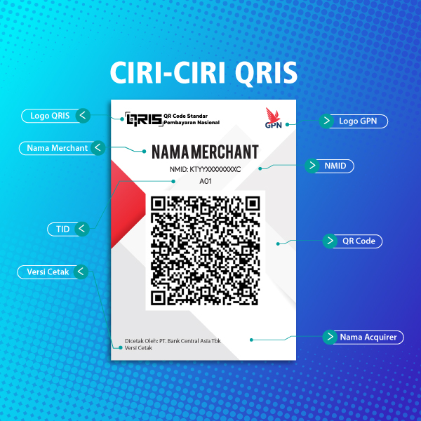 QRIS memiliki ciri-ciri khusus seperti logo QRIS (kiri atas), logo GPN (kanan atas), nama outlet / merchant (di atas QRIS), terminal ID dan QR code, dan memiliki warna dasar putih dengan aksen merah di sisi kiri dan kanan bawah QR.