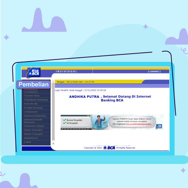 Melalui KlikBCA, kamu bisa bayar berbagai tagihan dan melakukan pembelian seperti: