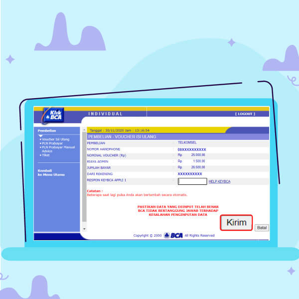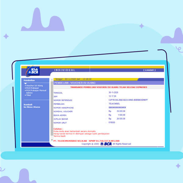 - Pembelian kamu berhasil! Bukti transaksi akan dikirimkan melalui email yang terdaftar di KlikBCA kamu atau kamu bisa melihatnya kembali di menu “Histori Transasksi” di KlikBCA.